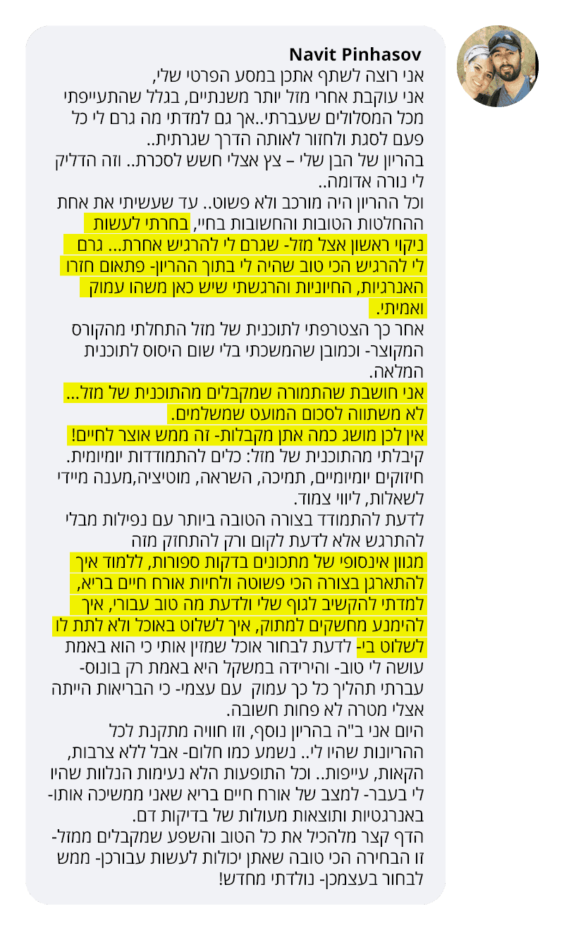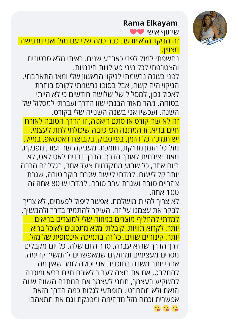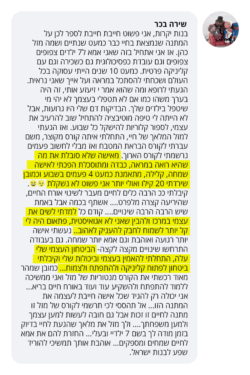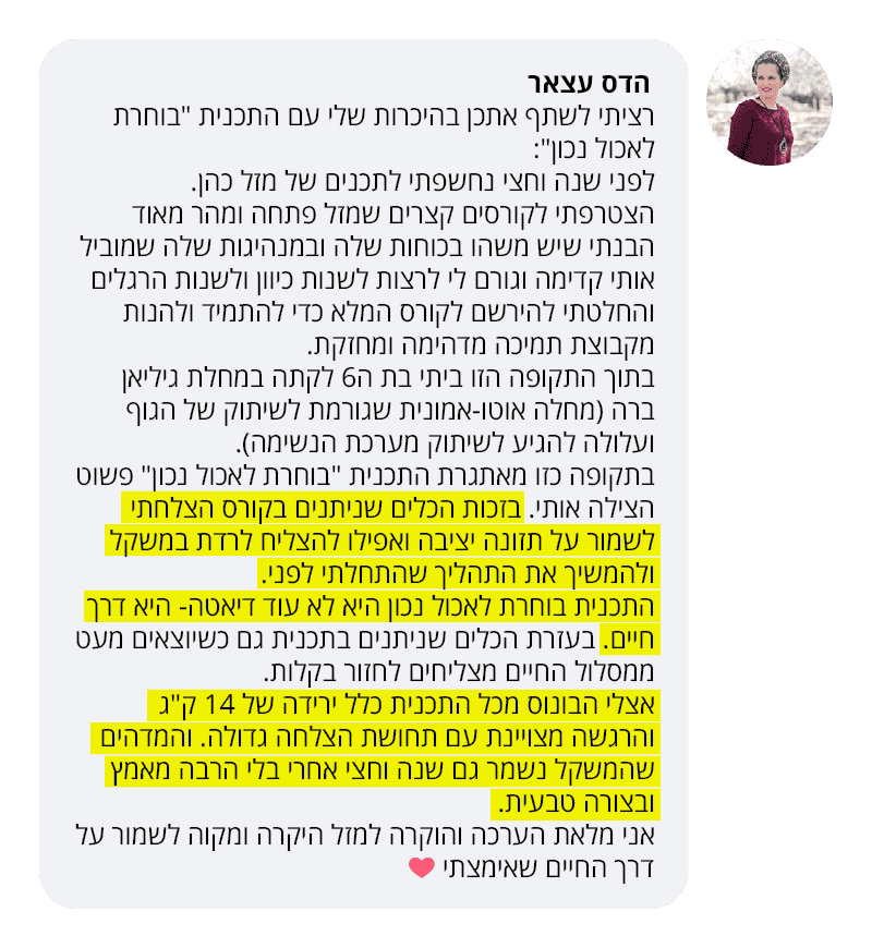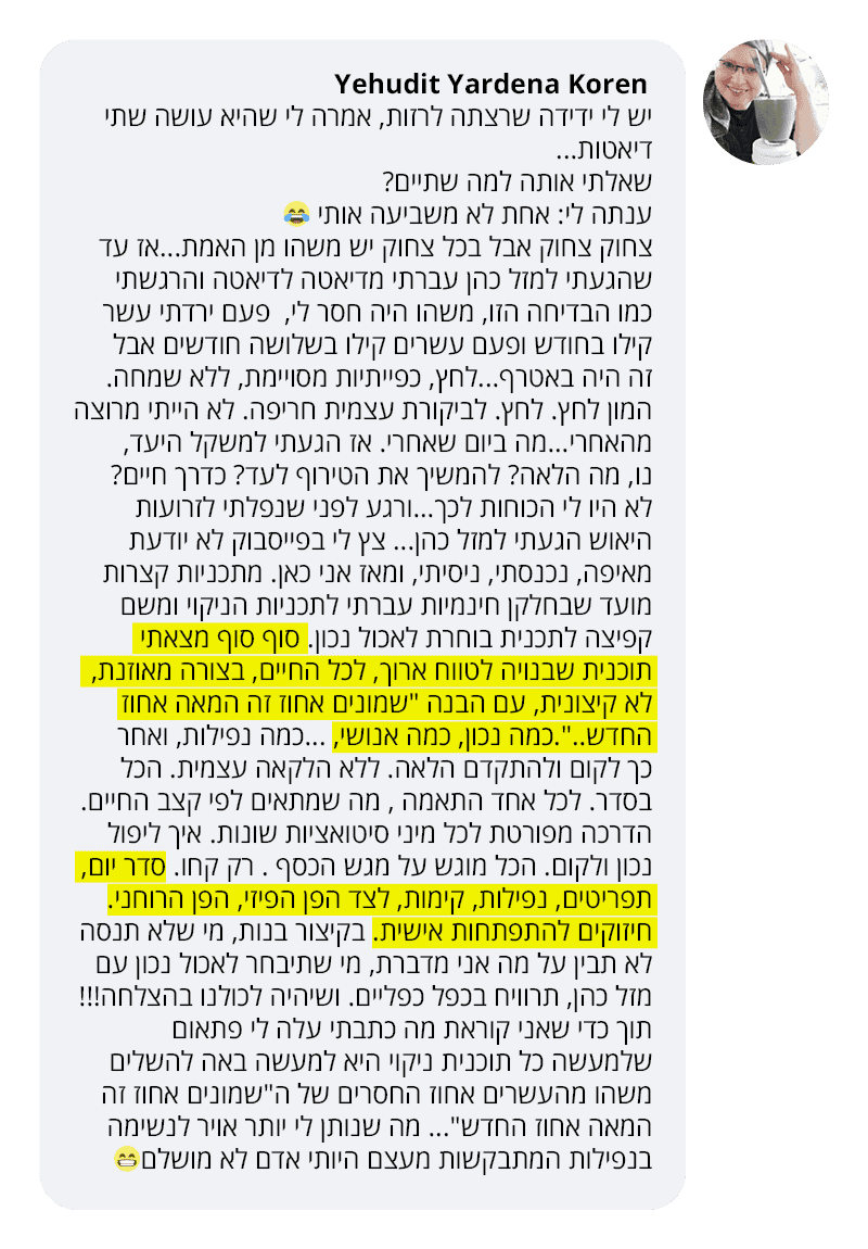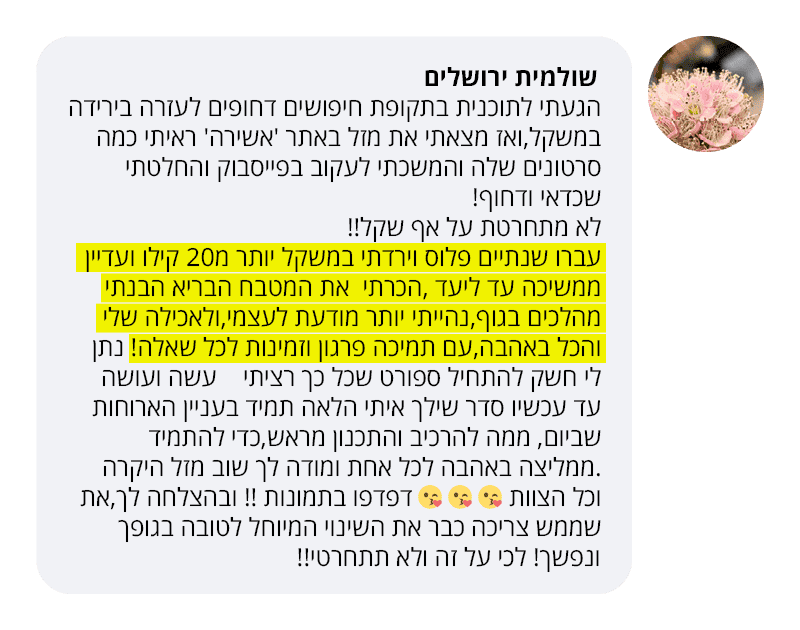 בעקבות ההצלחה הענקית שחוויתי בתהליך שלי, החלטתי לפתוח קבוצת פייסבוק ולעזור לעוד נשים, הנשים הללו חוו פריצות דרך שאפילו אני הופתעתי ואז הבנתי שיש כאן בשורה מצילת חיים לנשים, וזו השליחות שלי בשבילך.