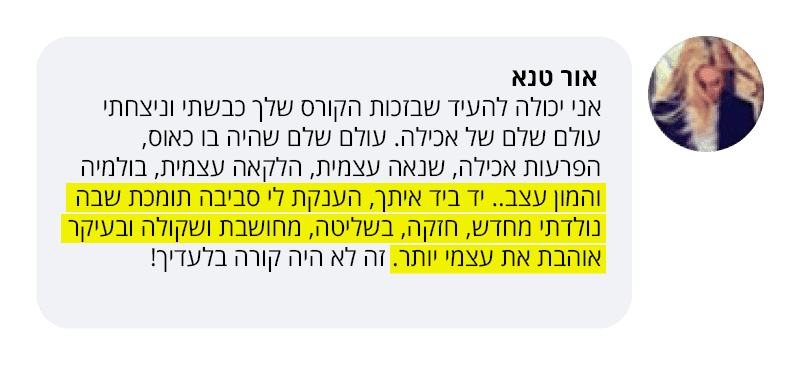 התחושה היא כאילו משהי אחרת השתלטה עליי ולקחה לי את זכות הבחירה. הבנתי שאין סיכוי שאני אצליח לרדת במשקל ולשמור עליו כל עוד אני לא אלמד לשלוט באכילה שלי, החלטתי לא לוותר ולמצוא את הדרך שלי להצליח!
