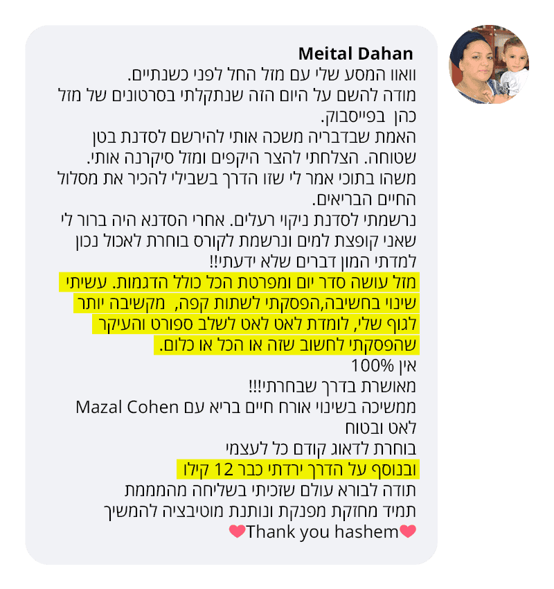אחרי שמצאתי את הדרך שלי ופיתחתי את שיטת האכילה של מזל כהן, הייעוד שלי הוא לעזור לעוד נשים להשתחרר מאכילה חסרת שליטה ולחיות חיים אנרגטיים ואיכותיים!