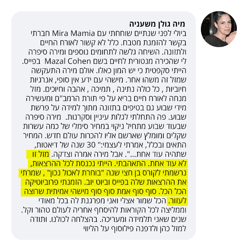 אלפי נשים כבר למדו כלים מתוך 'שיטת האכילה של מזל כהן'