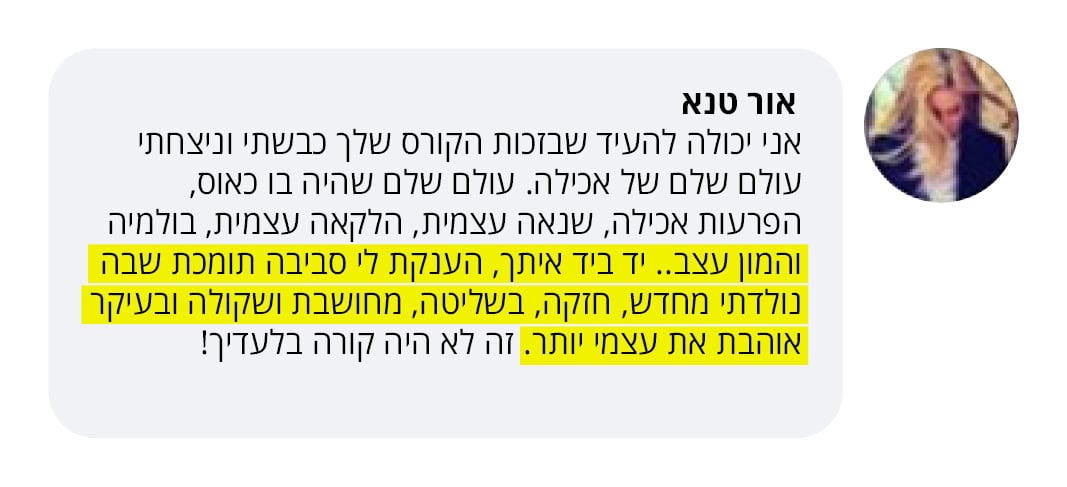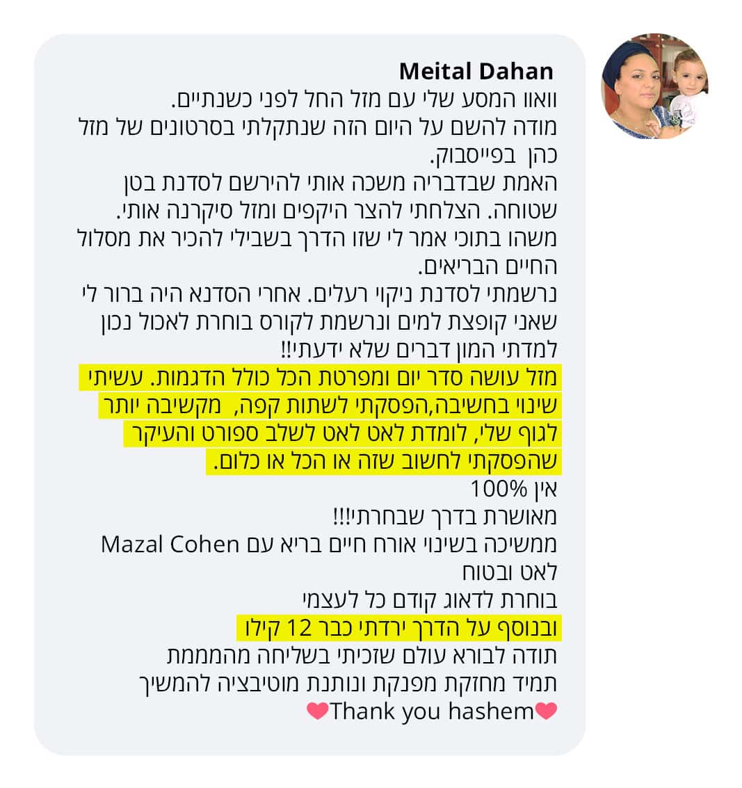 6. ואחרון. השיטה שלנו משלבת גוף -נפש, במטרה לעזור לך לבנות חוסן מנטאלי , להצליח לאמץ את השינוי הזה כדרך חיים , השיטה מלאה בכלים מנטלים מדויקים שעוזרים להתמודד בזמן משברים, בזמן יציאה מחוץ לשגרה וכול׳. כמו שאת מבינה – זה לא עוד טרנד, זה לא עוד שיטה שכולם נוהרים אחריה ואחרי כמה זמן היא פשוט נעלמת ומגלים שהיא היתה שיטה מזיקה. יש כאן דרך חיים שעובדת כבר עשור לאלפי נשים, וזו אחת המתנות הכי גדולות שאת יכולה לעצמך