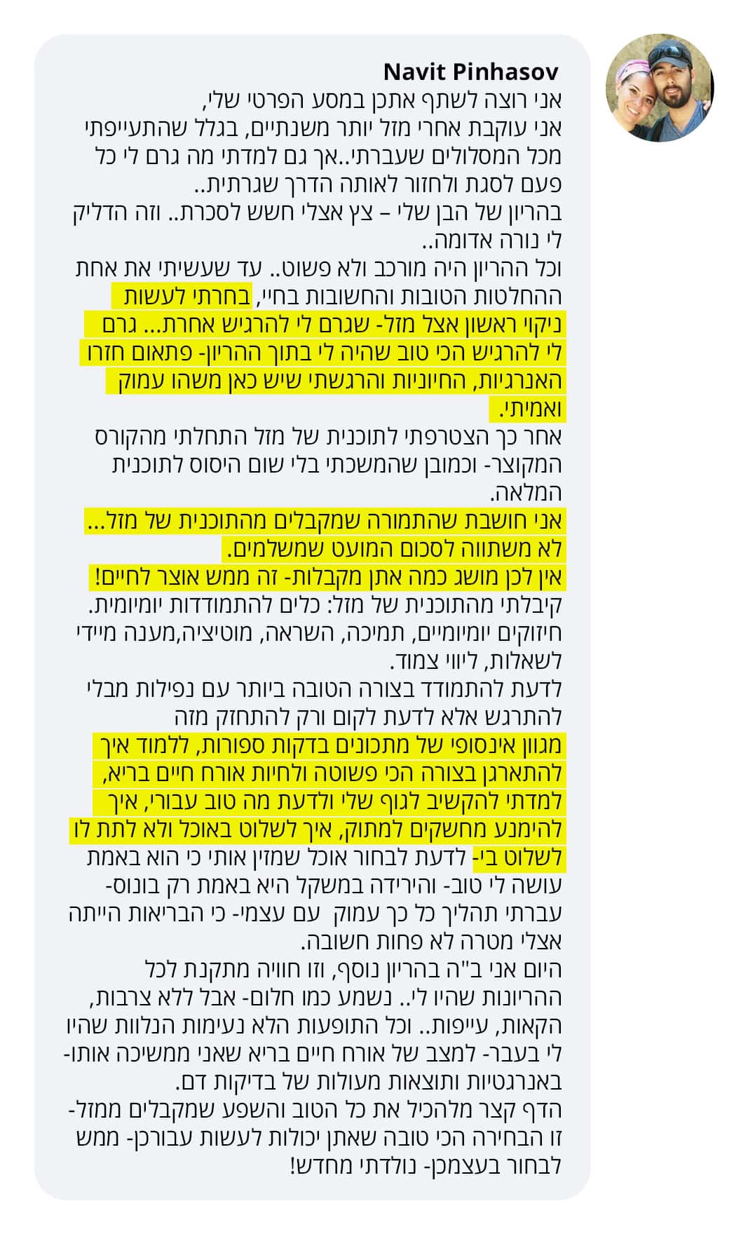 אנחנו רוצים שתצליחי ולכן בנינו במיוחד בשבילך מעטפת הצלחה, הכוללת קבוצת ווצאפ שקטה שבה תקבלי תזכורות ליישום עוגני הבריאות של מזל, הפניה לתכנים חדשים שעולים ועוד הפתעות שיעזרו לך להצליח ולמקסם את המנוי שלך.