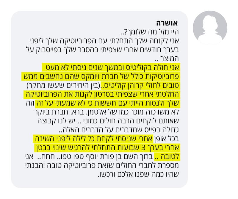 הרומן של עם הפרוביוטיקה התחיל שנה אחרי שחיליתי, בעקבות המחקר והלמידה שלי, הבנתי שזה מה שיעזור לי להבריא את הגוף לגמריי ובמהירות, שנים חיפשתי פרוביוטיקה שתהיה לשביעות רצוני ולא מצאתי, גיליתי שכל התוספים בשוק