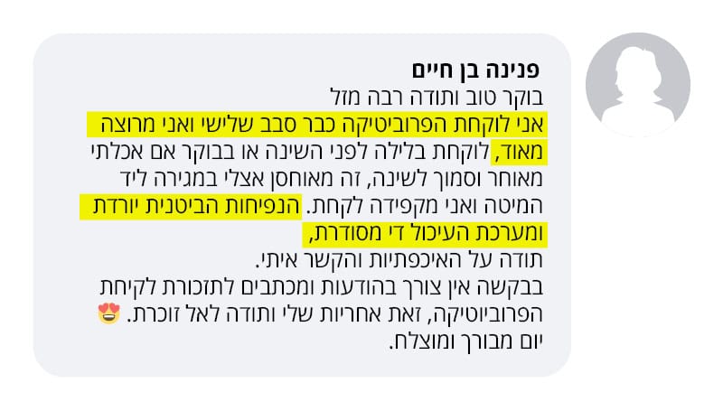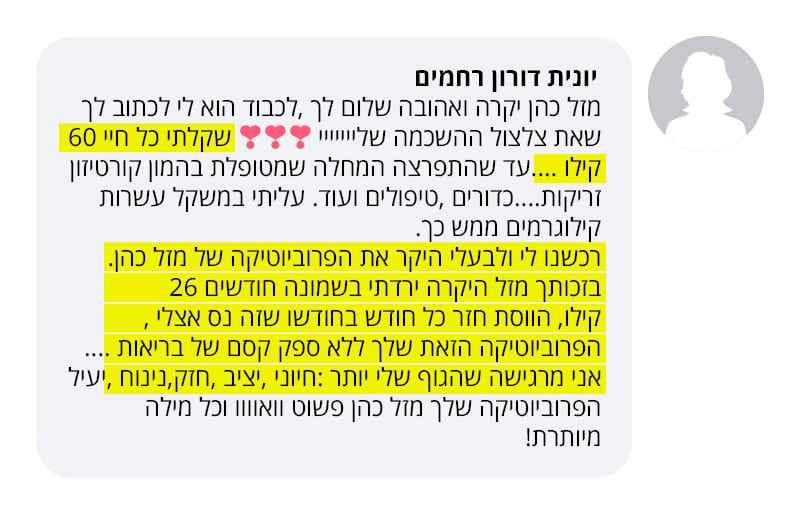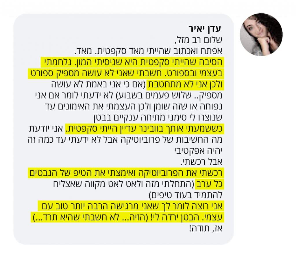 אז החלטתי להקדיש את כל הניסיון, הידע והתשוקה שלי, כדי להוציא פרוביוטיקה ייחודית, ברמה הגבוהה ביותר ובטכנולוגיה המתקדמת ביותר מבלי להתפשר על האיכות ואכן יצרתי כזו ורק בחצי שנה האחרונה רכשו אותה במעל 3000 יחידות.