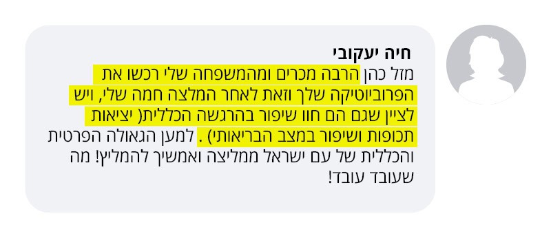 לפני 6 שנים הייתי חולה מאוד, מהרגע שהתחלתי עם פרוביוטיקה באופן קבוע ויום יומי, הגוף שלי התחיל להתרפא.